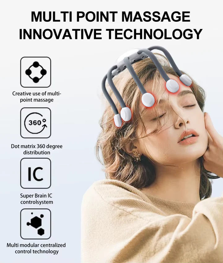 Experience a Realistic Massage with our 360° simulated human finger kneading head massager, designed to relieve scalp stress and promote relaxation.